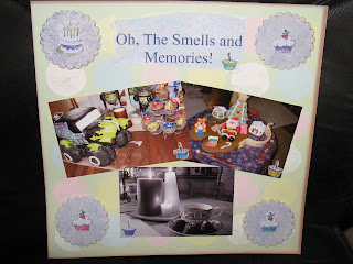 This lo was done to show things that we have smelled that bring back memories. I will always smell the buttercream and peanut butter from this Grave Digger Monster Truck Cake that I did for our son. The smell of gingerbread brings back fond memories of this show piece I did for a local Christmas Festival that raises money for the arts. I even won a ribbon for it! Oh and the smell of the chocolate truffles I made and my favorite tea still to this day smells so good even though they are nothing more than a memory. This lo was actually done for 2 challenges. One was a stamping challenge so I used acrylic stamps to make the cake and cupcakes for embellishments and the other was a smell challenge where I needed to do a lo of things I've smelled that bring back memories. It is one of my favorite lo's.